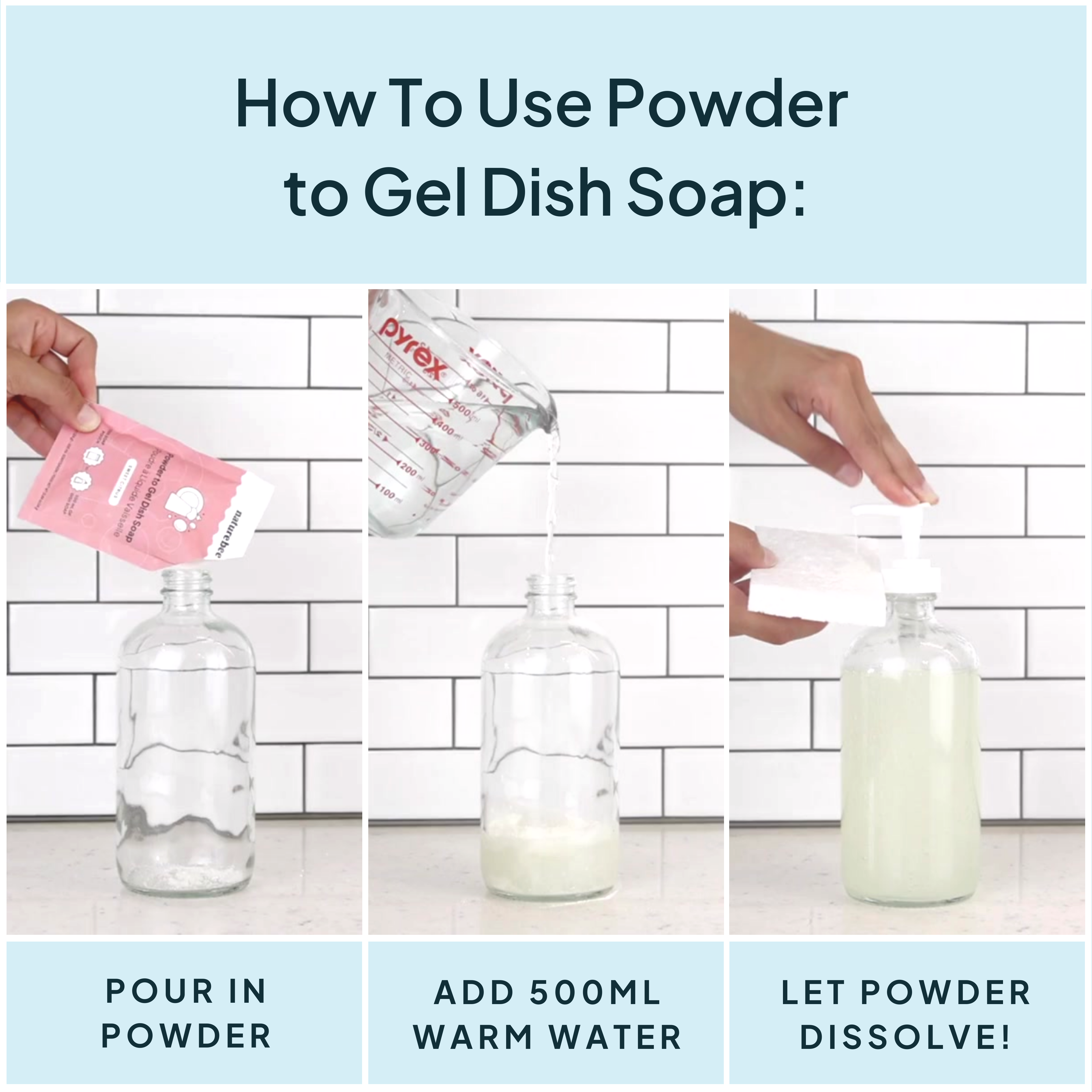 - Pour the powder contents (24g) into a dish soap container of choice.