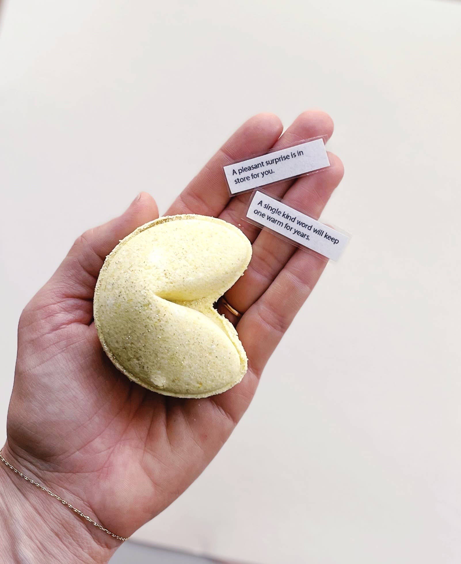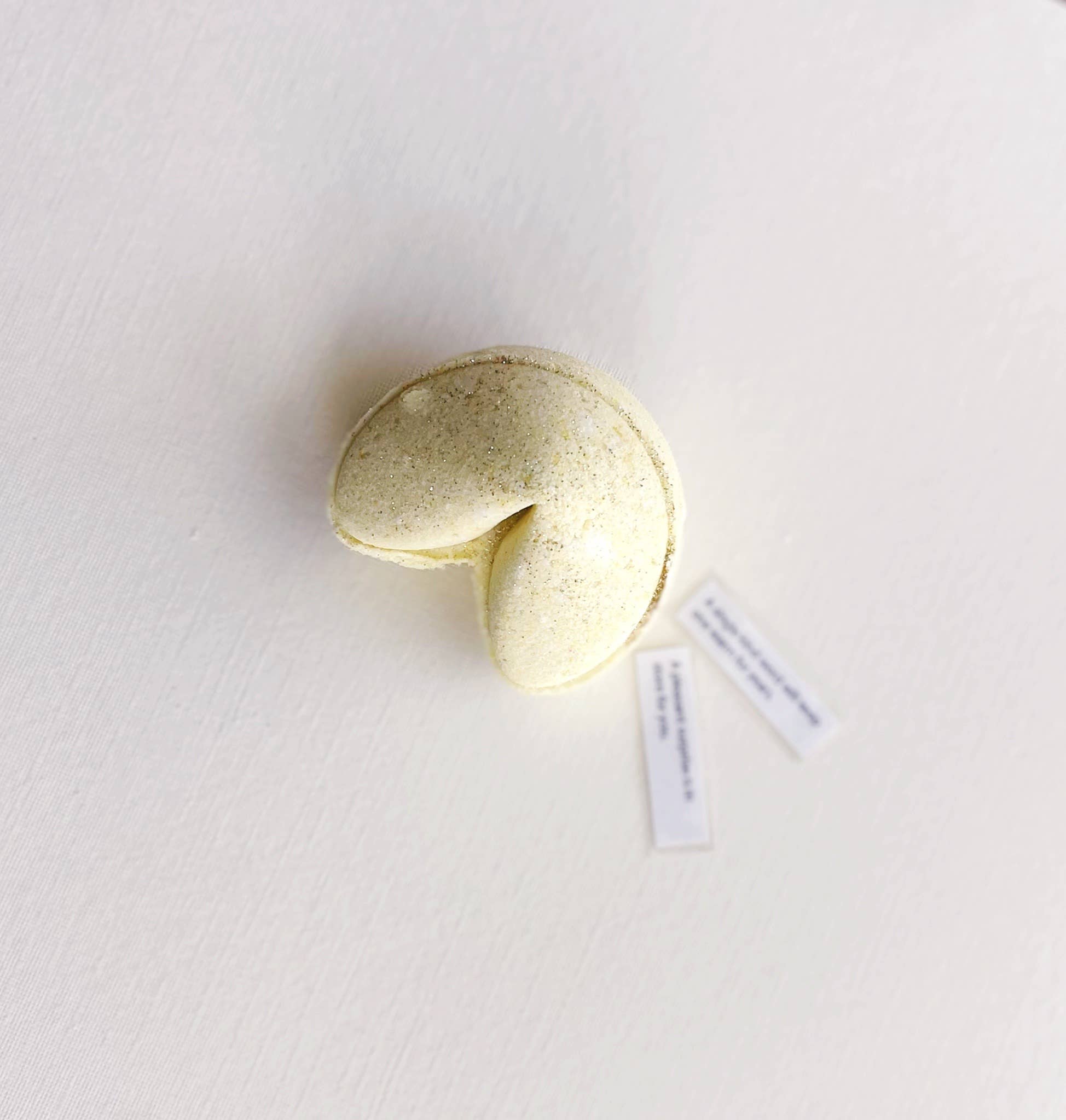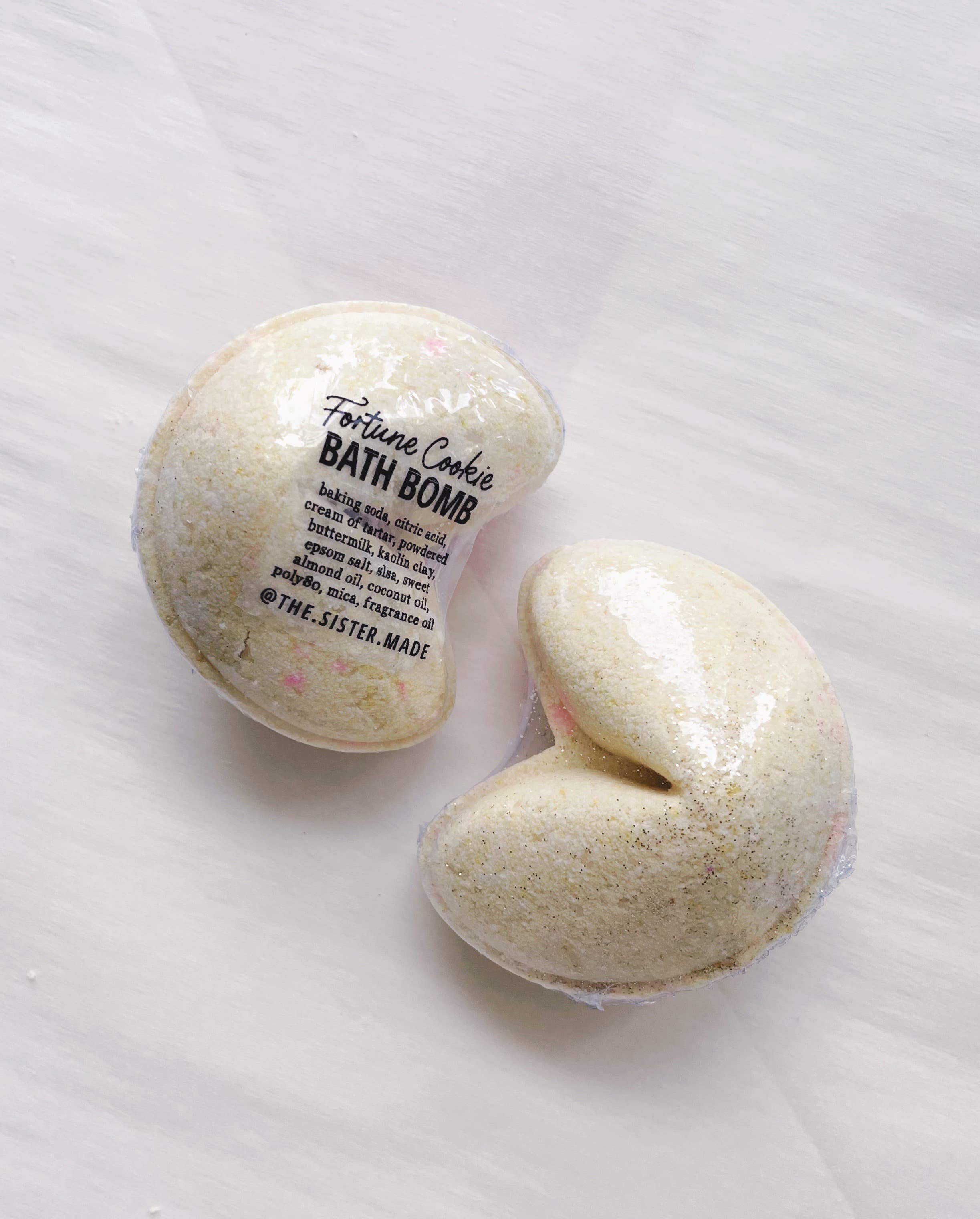 Unwrap the magic of our fortune cookie bath bomb! Shaped like a classic fortune cookie, this delightful bath bomb transforms your bath into a fragrant oasis. As it fizzes away, releasing vibrant colors, a hidden message of positivity and good fortune is revealed! As always, made with all natural and skin safe ingredients! Baking soda, citric acid, kaolin clay, cream of tartar, epsom salt, powdered buttermilk, sweet almond oil, coconut oil, slsa, poly80, fragrance oil
