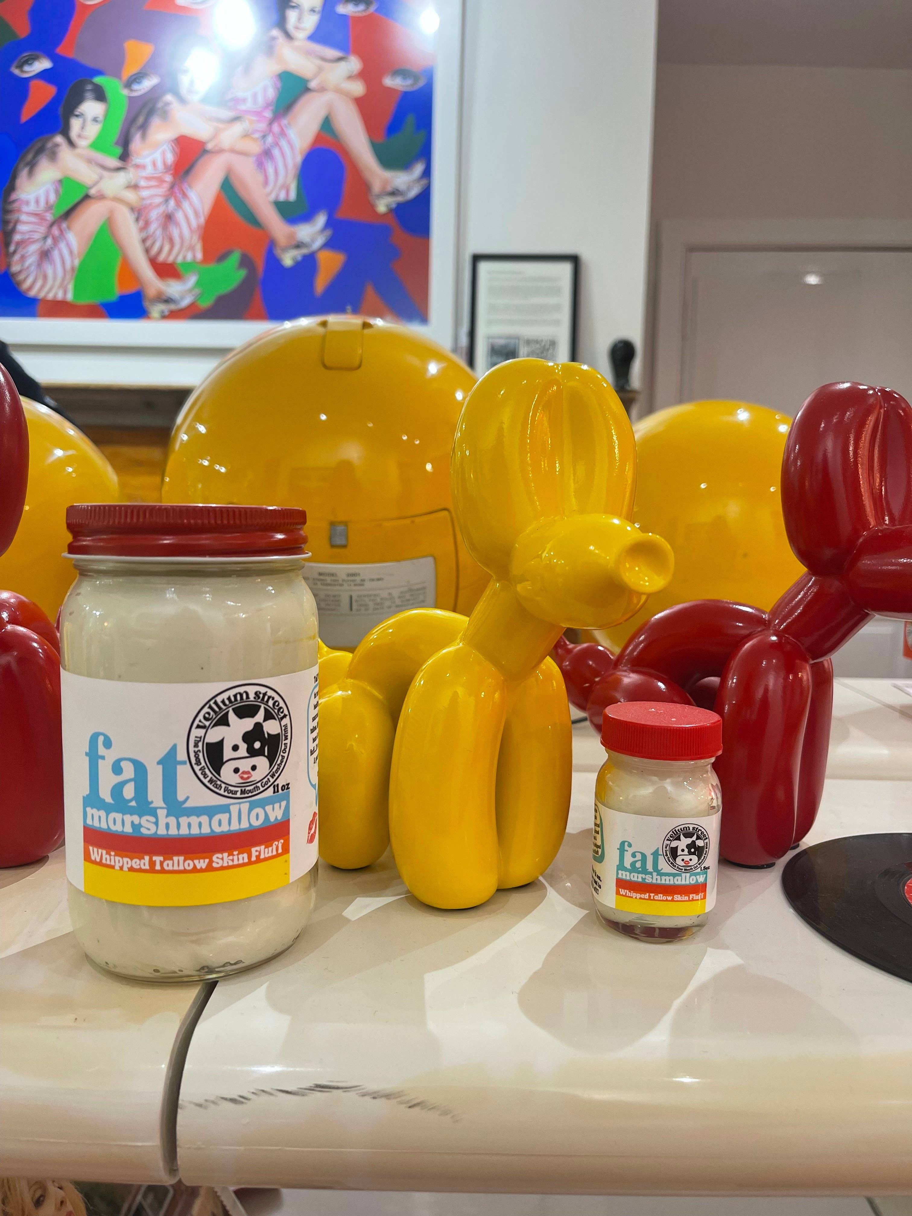 fat marshmallow is the ultimate healthy skin moisturizer! Biocompatable grass fed tallow, lightly scented with real vanilla beans and whipped into the creamiest fluff...its a treat your skin won't forget and your mouth may be a little jealous of! Slather it on, but try not to lick it off! fat marshmallow is quite simply, a whipped tallow skin fluff- a whipped body butter. It is the most pared down & simple of our recipes: tallow, a bit of beeswax, infused with vanilla bean & marshmallow root, with no additional colors or fragrances, plus just a dash of arrowroot added to keep it from being too greasy upon application. Product is sold by weight, and each jar contains 11 oz of fluff.