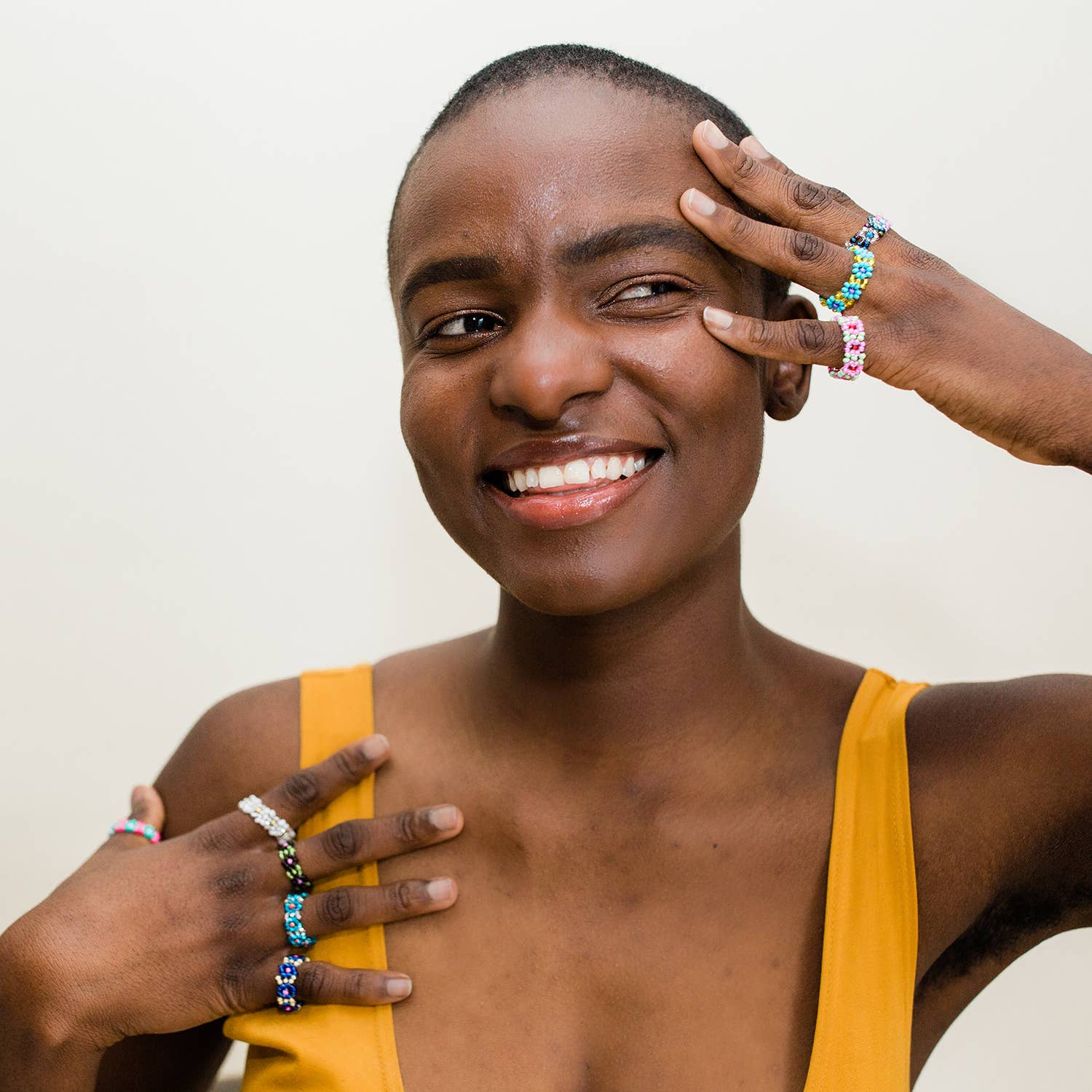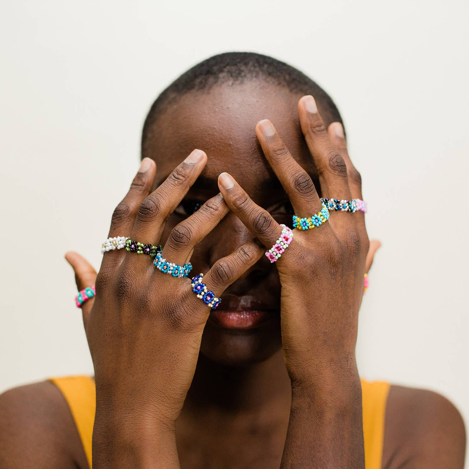 Add a touch of charm and color to your look with our handcrafted Flower Beaded Ring. Featuring a delicate daisy chain pattern that wraps around the entire circumference, this ring offers a playful and elegant way to dress up your fingers. Available in a variety of vibrant colors and sizes, each ring is made with attention to detail and love by skilled artisans in Guatemala. Perfect for layering or wearing solo, this unique accessory is a celebration of both style and craftsmanship. With every purchase, you’re not only adding a beautiful piece to your jewelry collection, but also empowering artisans and supporting fair trade practices.
