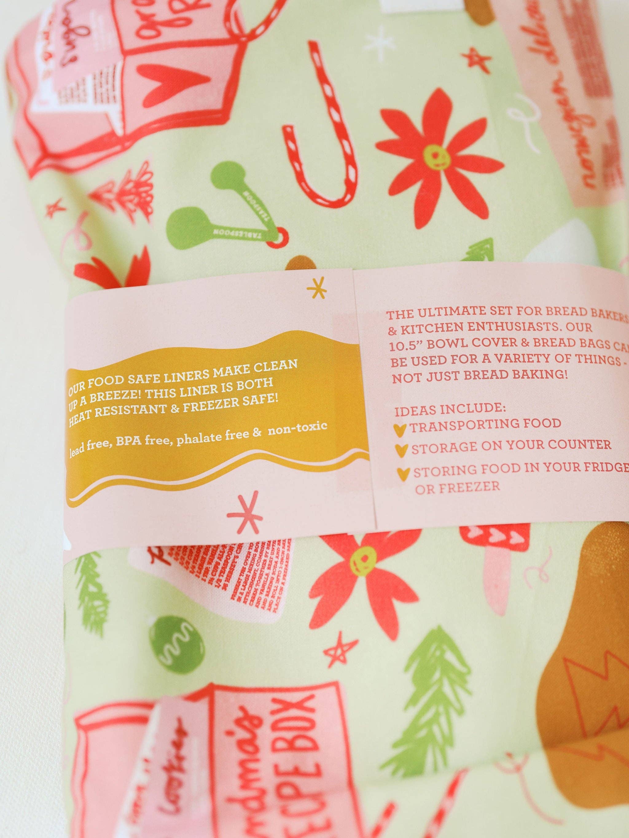 The Heirloom Baking Bread Set includes a festive green bowl cover and a crisp white bread bag—both sprinkled with nostalgic illustrations of recipe cards, candy canes, gingerbread cutters, and all the things that make holiday baking extra sweet. Perfect for proofing, storing, gifting, or just adding nostalgia-inspired charm to your cozy kitchen moments. A beautiful blend of tradition and function! Features: * Food safe, non-toxic liner to make clean up a breeze! * Machine washable! * Freezer friendly © Doe A Deer LLC. All Rights Reserved. Illustrations and product images may not be used or reproduced without consent.